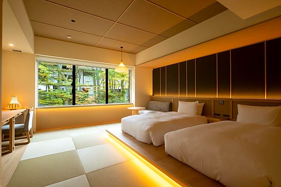 The spacious air-conditioned twin room provides a flat-screen TV, tatami, an electric kettle and a sofa. The unit offers 2 beds and 2 futons.